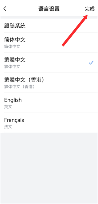 2、進入語言設置頁面后,選擇需要的語言,點擊完成按鈕。