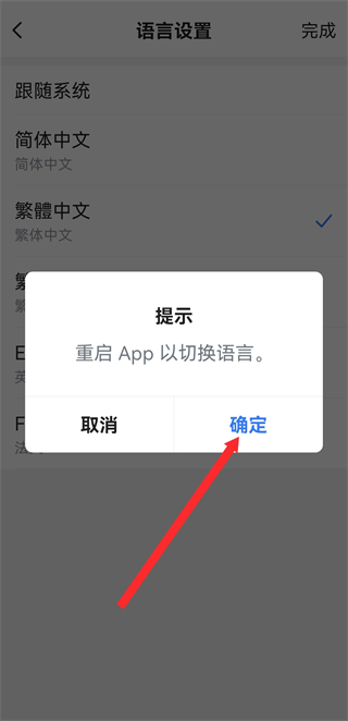 3、在彈出的重啟App以切換語言提示框中,點擊確定可完成設置。