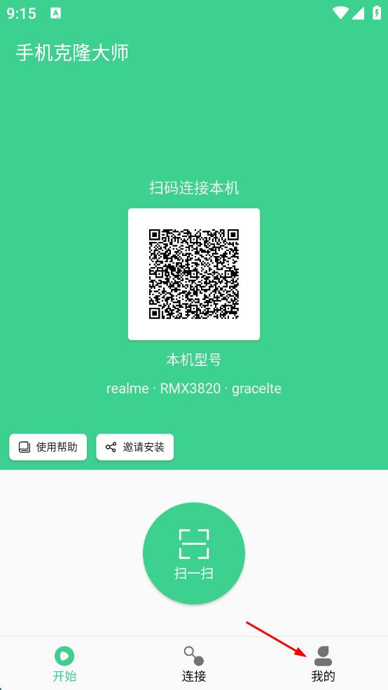 在手機(jī)克隆大師首頁,描另一部手機(jī)手機(jī)克隆大師上的二維碼連接設(shè)備;