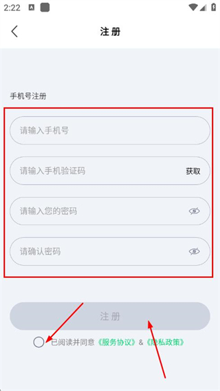 2、填寫手機(jī)號(hào)、手機(jī)驗(yàn)證碼、設(shè)置密碼并確認(rèn)密碼,勾選服務(wù)協(xié)議,點(diǎn)擊注冊(cè)。