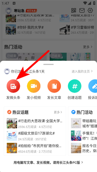 3、在創(chuàng)作功能的選項中,選擇發(fā)微頭條,進(jìn)入內(nèi)容編輯頁面。