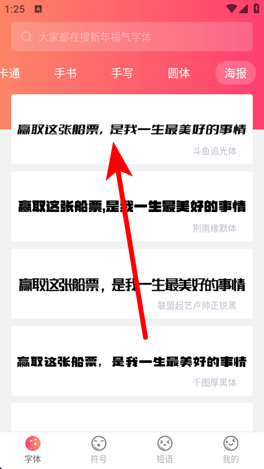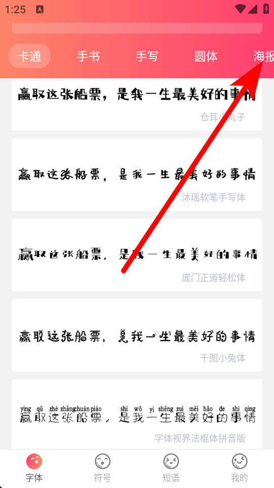 1、打開(kāi)字體設(shè)置相關(guān)應(yīng)用,在字體分類欄中點(diǎn)擊海報(bào)選項(xiàng)。