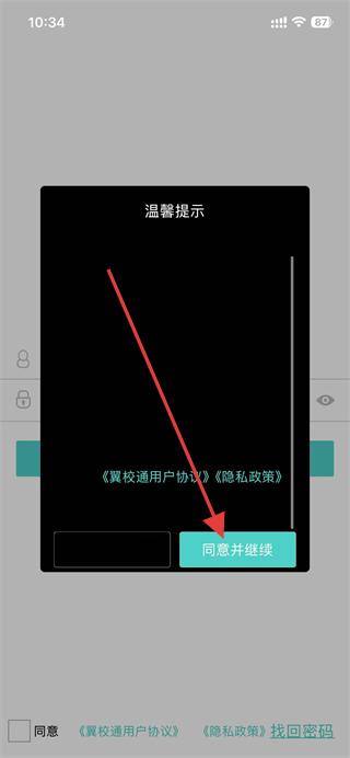 1、打開翼校通app,在彈出的提示框中點擊同意并繼續(xù)。