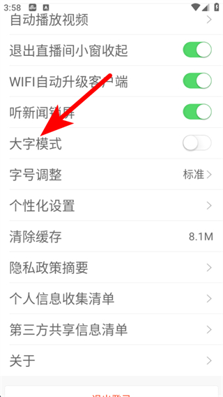 3、在設(shè)置界面找到大字模式選項,點擊進(jìn)入大字模式設(shè)置頁面。