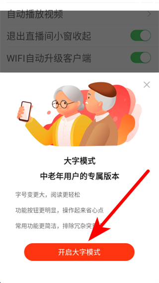 4、在大字模式設(shè)置頁面點擊開啟大字模式,即可完成大字模式的設(shè)置。