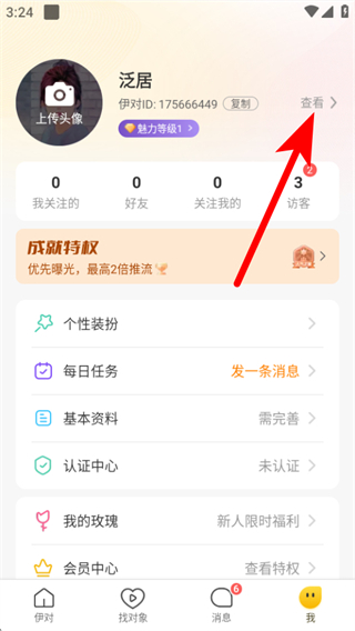 2、在個人頁面中,點(diǎn)擊昵稱右側(cè)的查看選項(xiàng)。