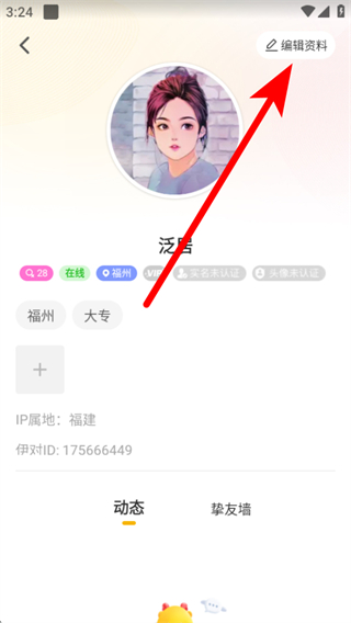 3、進(jìn)入個人主頁后,點(diǎn)擊右上角的編輯資料選項(xiàng)。