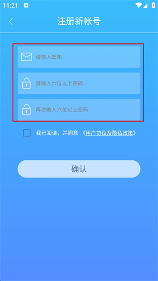 2、在注冊新帳號頁面,輸入郵箱,設(shè)置六位以上密碼并再次輸入確認(rèn)。