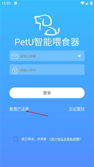 1、打開PetU智能喂食器APP,點(diǎn)擊“新用戶注冊”進(jìn)入注冊頁面。