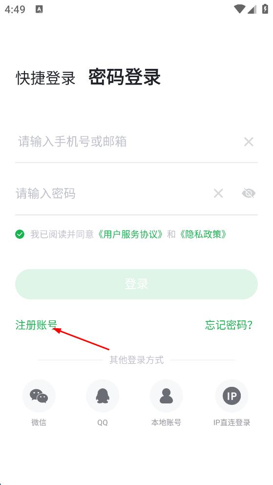 2、在密碼登錄頁面,點擊“注冊賬號”選項。