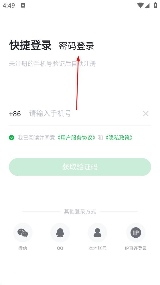 1、打開登錄軟件,在登錄頁面點擊“密碼登錄”選項。