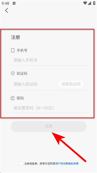 4、在注冊頁面,依次進(jìn)行信息填寫后,點(diǎn)擊注冊完成注冊操作。