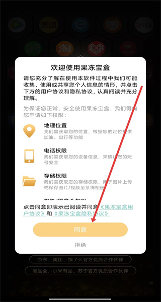1、打開果凍寶盒APP,彈出“歡迎使用果凍寶盒”權(quán)限提示窗口,點擊“同意”。