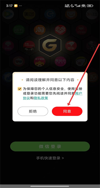 3、在彈出的用戶協(xié)議及隱私政策確認(rèn)窗口中,點擊“同意”。