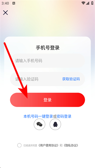 2、在個(gè)人頁(yè)面中,點(diǎn)擊手機(jī)圖標(biāo)樣式的登錄入口,進(jìn)入手機(jī)號(hào)登錄界面。