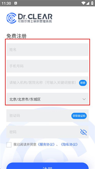 2、填寫姓名、手機(jī)號碼,輸入機(jī)構(gòu)/醫(yī)院名稱并搜索選擇,選擇所在省、市、區(qū)。