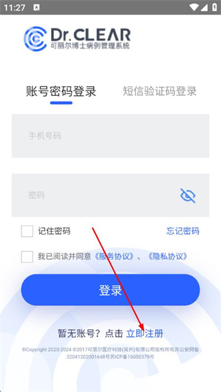 1、打開可麗爾博士APP,在登錄頁面點(diǎn)擊立即注冊。