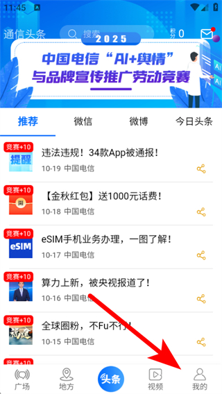 1、打開通信頭條app,在首頁點擊底部我的,進入個人中心頁面。
