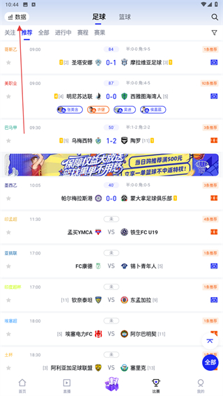 3、賽程界面,點(diǎn)擊相關(guān)場(chǎng)次可在預(yù)測(cè)頁查看比賽相關(guān)推薦,查詢即將進(jìn)行比賽以及正在比賽的賽程。