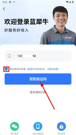 3、輸入收到的驗證碼,即可完成藍(lán)犀牛司機(jī)端的注冊流程。