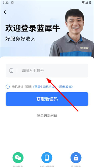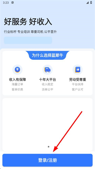1、在藍(lán)犀牛司機(jī)端app界面點擊登錄注冊按鈕,進(jìn)入登錄注冊頁面。