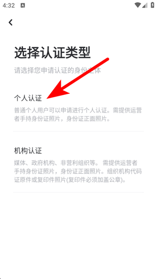 3、在這個(gè)頁(yè)面中,選擇個(gè)人認(rèn)證,進(jìn)入個(gè)人認(rèn)證信息填寫頁(yè)面。