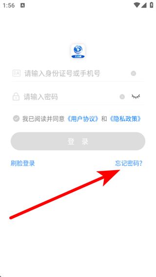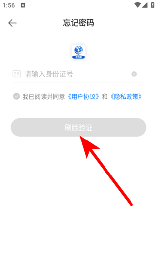 2、在忘記密碼的頁(yè)面,需要輸入身份證號(hào)后,點(diǎn)擊刷臉驗(yàn)證。