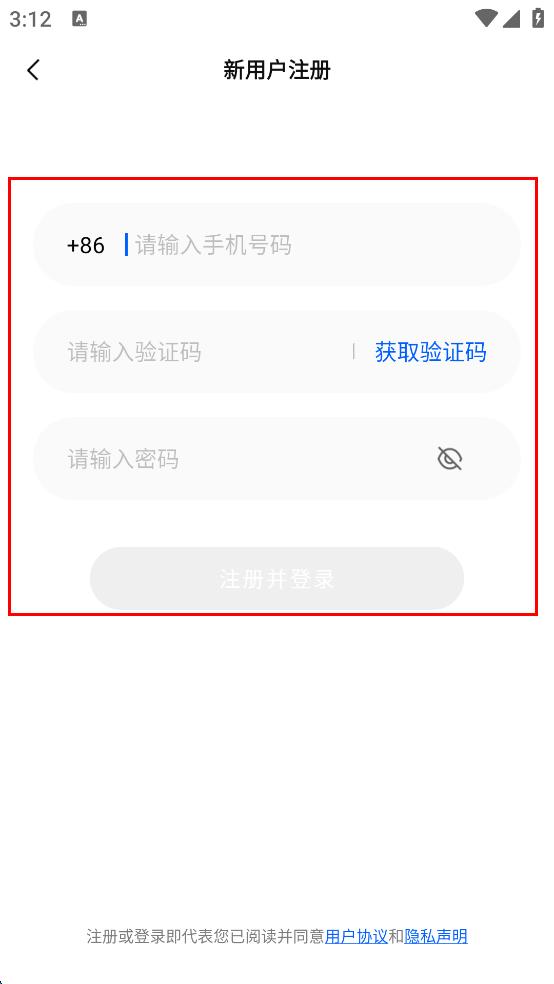 3、在新用戶注冊界面輸入手機(jī)號(hào)碼、驗(yàn)證碼、密碼,點(diǎn)擊注冊并登錄,完成賬號(hào)注冊。