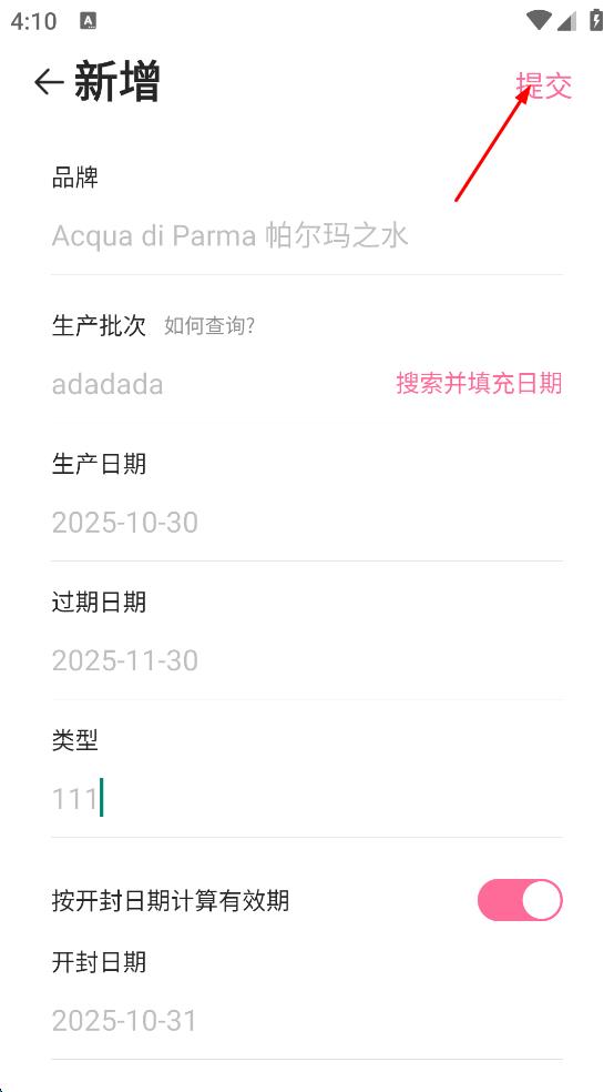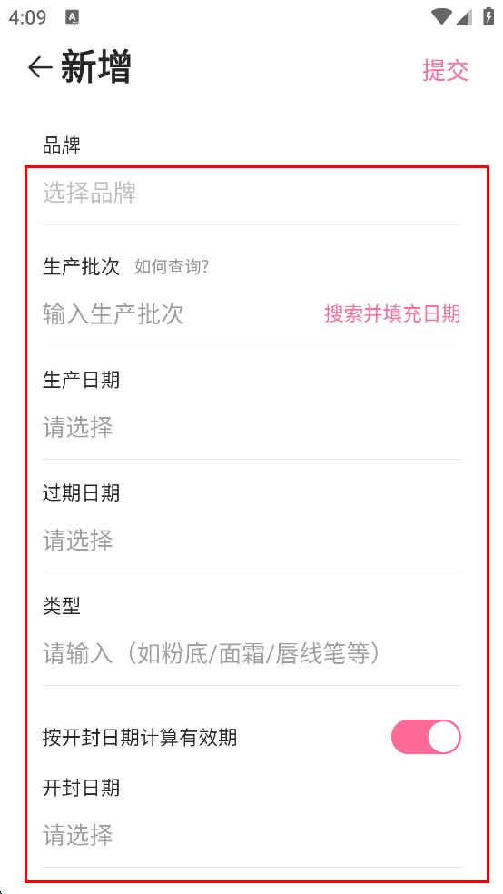 3、在新增頁面,依次填寫品牌、生產(chǎn)批次、生產(chǎn)日期、過期日期、類型、開封日期等信息。