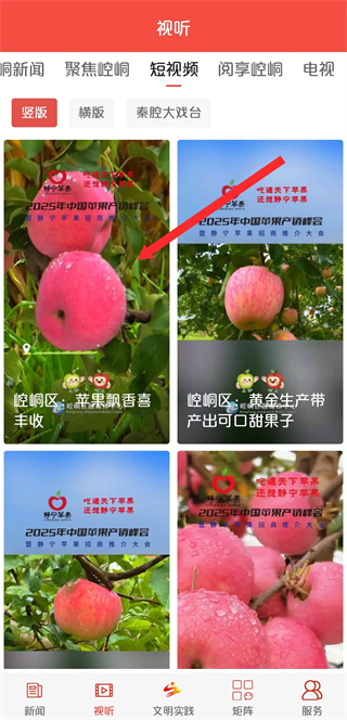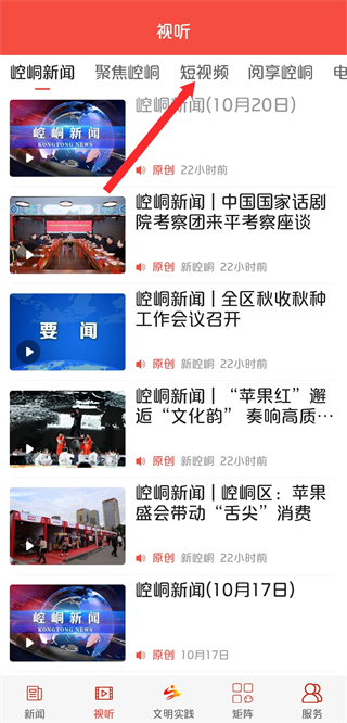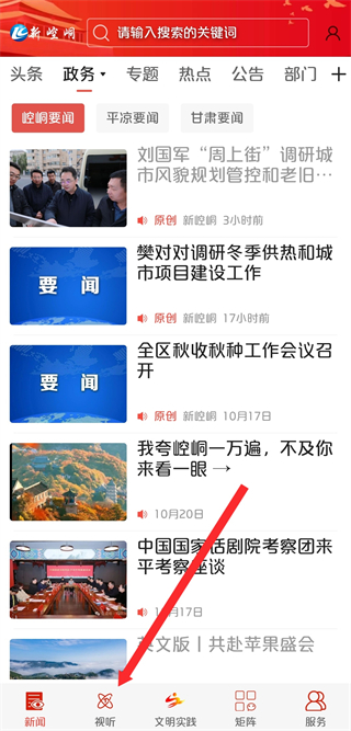 1、打開新崆峒app,需要點(diǎn)擊底部視聽按鈕,進(jìn)入視聽的頁面。