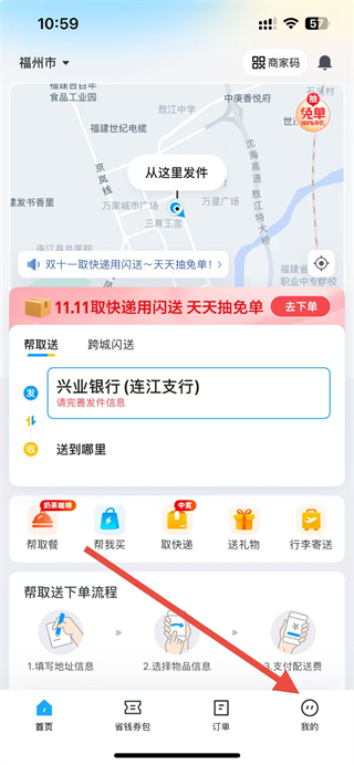 1、在閃送員app首頁(yè)點(diǎn)擊我的選項(xiàng),進(jìn)入個(gè)人頁(yè)面。