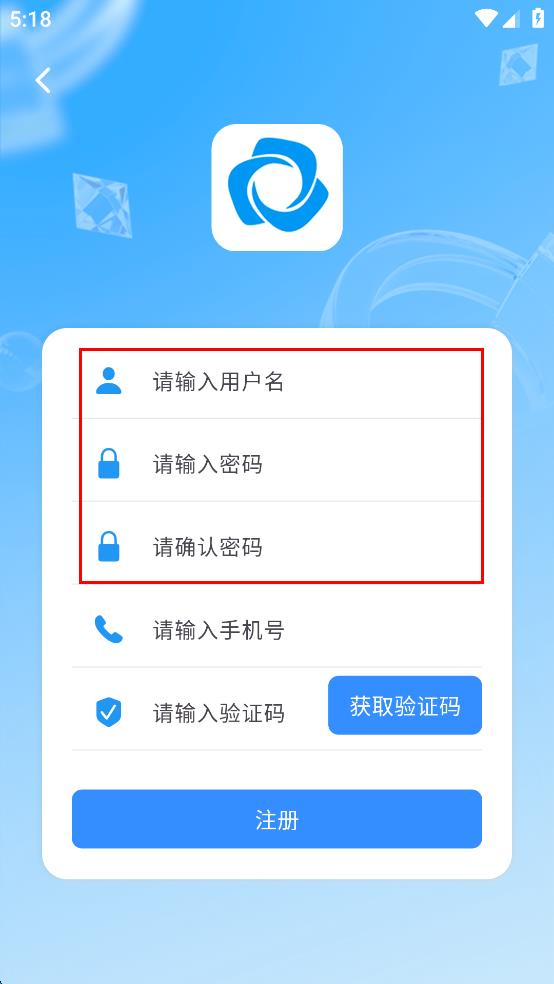 2、在注冊(cè)頁(yè)面依次輸入用戶名、密碼、確認(rèn)密碼,完成基礎(chǔ)信息填寫(xiě)。