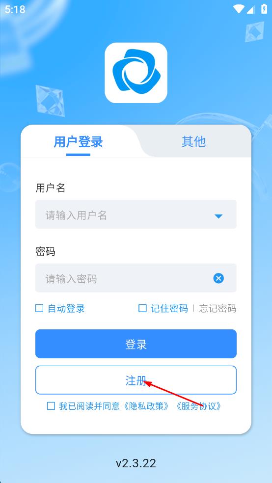1、進(jìn)入軟件登錄界面,點(diǎn)擊注冊(cè)按鈕,進(jìn)入注冊(cè)頁(yè)面。