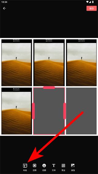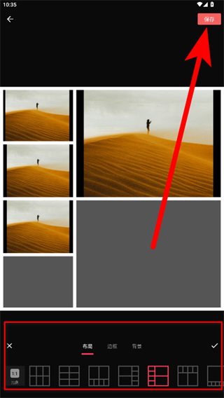 3、進入拼圖編輯頁面,可通過底部布局等功能調(diào)整效果,完成后點擊保存。
