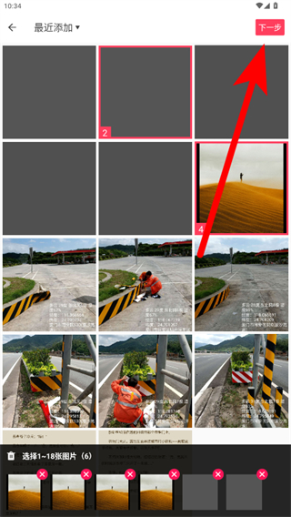 2、選擇1-18張圖片后,點擊右上角下一步按鈕。