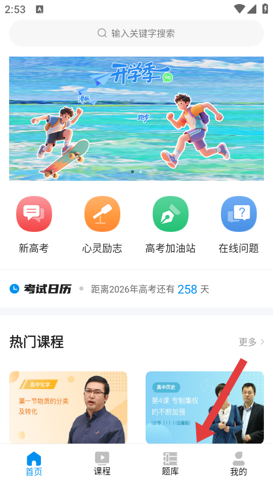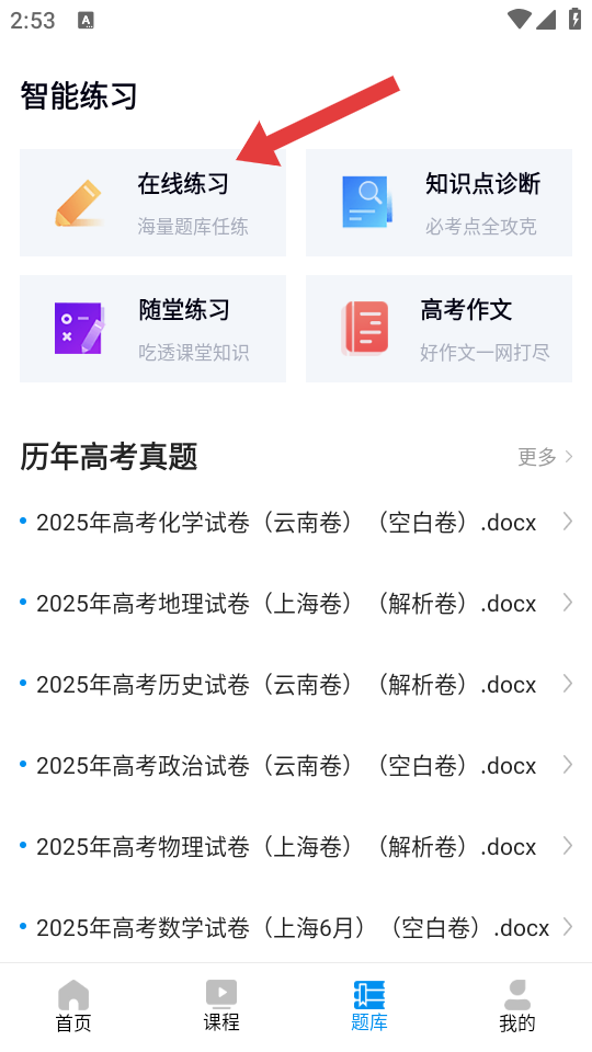 2、在題庫頁面點擊在線練習,進入在線刷題的科目和年級選擇界面。