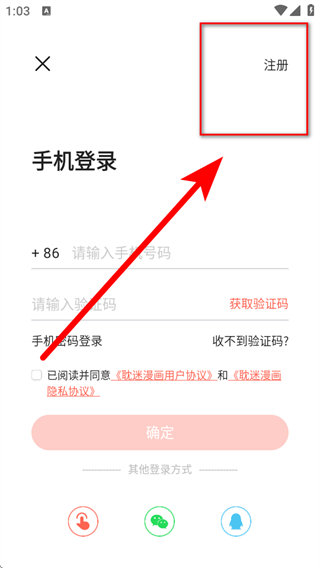 3、在手機(jī)登錄頁面點(diǎn)擊注冊,進(jìn)入注冊界面。