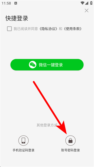 3、在快捷登錄的界面,點(diǎn)擊賬號(hào)密碼登錄,進(jìn)入賬號(hào)密碼登錄頁面。