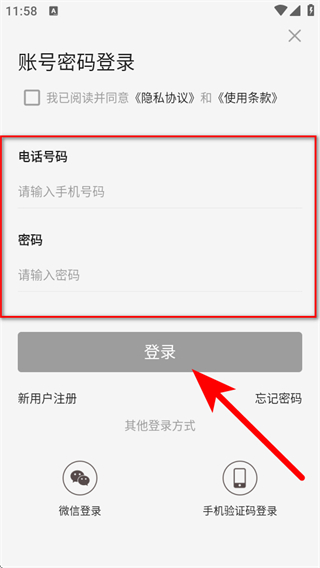 4、在該頁面輸入電話號(hào)碼、密碼,點(diǎn)擊登錄完成賬號(hào)密碼登錄操作。