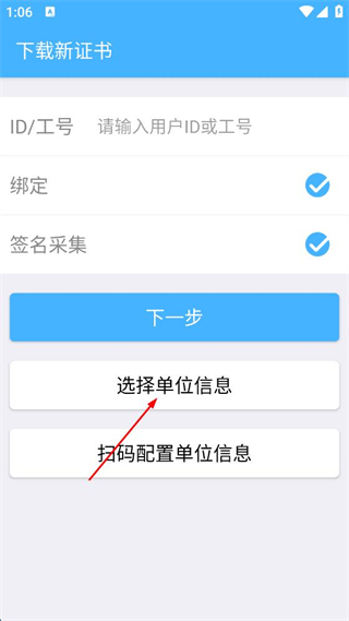 1、進(jìn)入下載新證書頁(yè)面,點(diǎn)擊選擇單位信息。