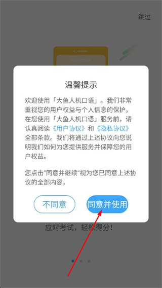1、打開(kāi)大魚(yú)人機(jī)口語(yǔ),在提示彈窗中點(diǎn)擊同意并使用按鈕。