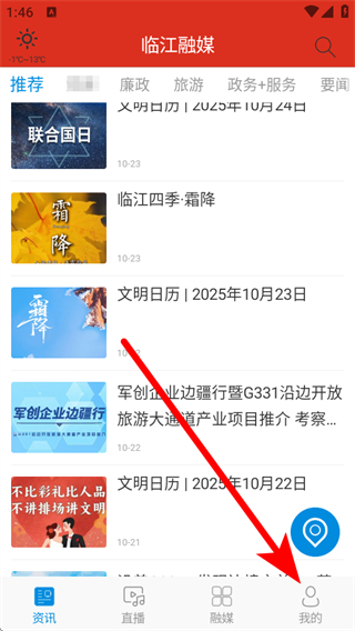 1、打開臨江融媒APP首頁,點(diǎn)擊底部我的按鈕,進(jìn)入個(gè)人頁面。
