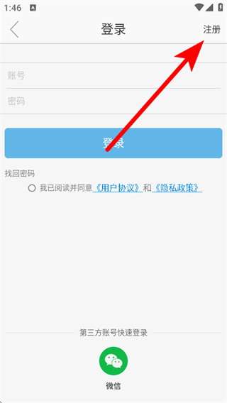 3、在登錄界面,點(diǎn)擊右上角注冊,進(jìn)入注冊信息填寫的頁面。