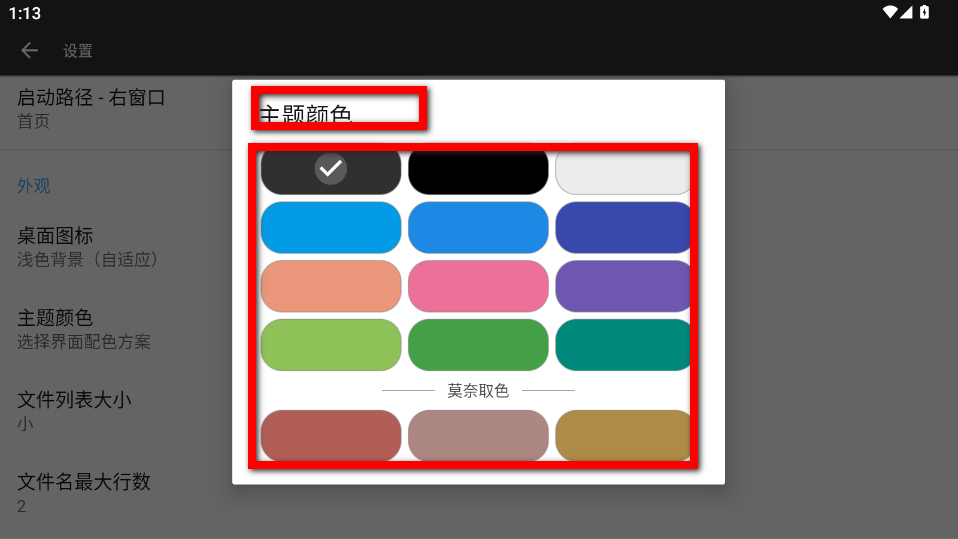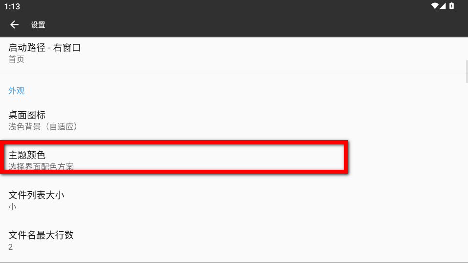 3、在設(shè)置頁(yè)面,點(diǎn)擊主題顏色選項(xiàng),進(jìn)入顏色選擇界面。