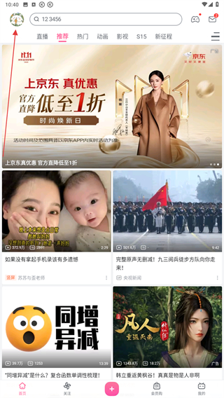 1、打開(kāi)嗶哩嗶哩的APP,進(jìn)入首頁(yè)點(diǎn)擊左上角用戶頭像。
