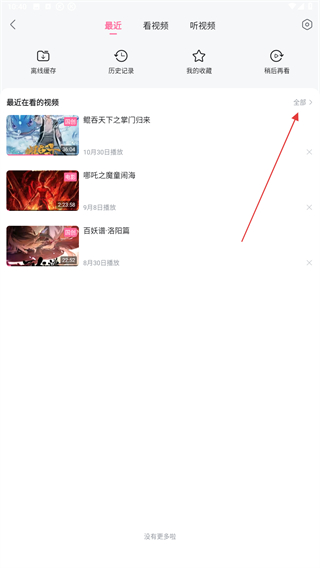 2、進(jìn)入最近的界面內(nèi),點(diǎn)擊最近觀看視頻右側(cè)全部的按鈕。