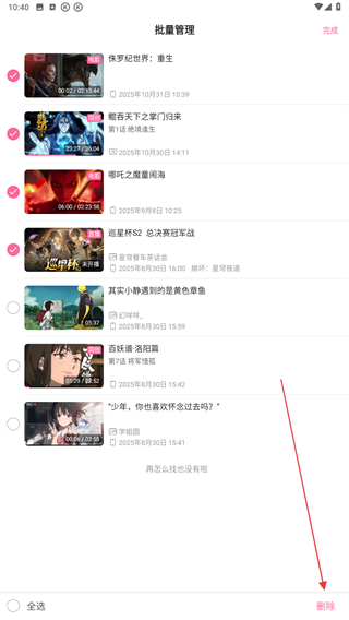 4、勾選要?jiǎng)h除的視頻記錄后,點(diǎn)擊右下角刪除的按鈕即可。
