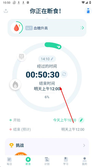 3、確認(rèn)后,APP會(huì)自動(dòng)計(jì)算斷食經(jīng)過的時(shí)間和結(jié)束時(shí)間,并實(shí)時(shí)追蹤斷食進(jìn)度。