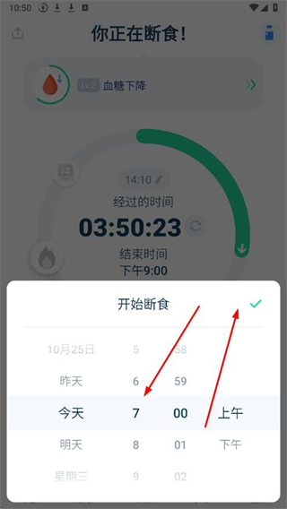 2、在彈出的時(shí)間選擇框中,設(shè)置開始斷食的時(shí)間,然后點(diǎn)擊對(duì)勾確認(rèn)。
