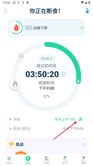 1、打開斷食追蹤APP,在你正在斷食頁面,點(diǎn)擊開始時(shí)間旁邊的編輯圖標(biāo)。